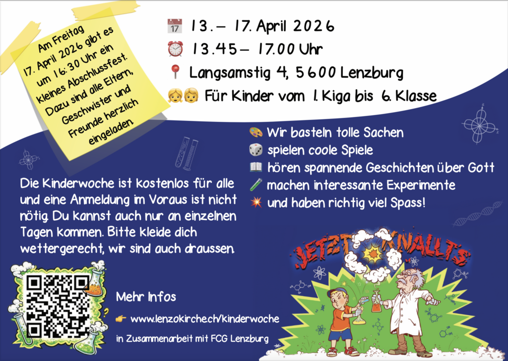 In der Kinderwoche erwarten dich Nachmittage voller Spass, Spannung und toller Gemeinschaft. Wir werden zusammen viele coole Spiele spielen, tolle Sachen basteln und spannende Geschichten über Gott hören.